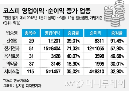 한국거래소에 따르면 코스피 상장사(12월결산법인, 개별기준) 1분기 실적 분석 결과 전기전자(71.3%) 음식료품(40.1%) 건설(39.0%) 등 업종의 영업이익 증가률이 높았던 것으로 집계됐다. 종목별로도 GS건설(561.2%) 삼성전기(503.1%) 동부건설(386.9%) 태영건설(223.2%) 등이 영업이익이 크게 개선됐다.