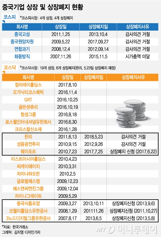 ◇10번째 퇴출된 中 기업…남은 중국기업은=완리는 한국 증시에서 상장폐지되는 10번째 중국기업이 됐다. 2011년 6월13일 코스닥에 상장한 완리는 감사의견 거절로 상장폐지 사유가 발생, 7년 만에 코스닥을 떠난다.