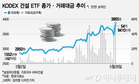 건설업종에 대한 관심이 높아지면서 거래량이 많지 않던 건설 ETF 거래대금도 한 달 만에 두 배 수준으로 급증했다. 한국거래소에 따르면 KODEX건설ETF 일평균 거래대금은 4월 9억7000만원 수준에서 5월(25일까지) 26억원으로 급증했다.