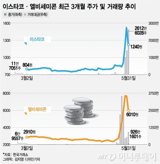 거래소는 전날 이스타코를 '소수계좌 매수관여 과다종목'으로 명시, 투자주의종목으로 지정했다. 거래소는 상위 20개 계좌 매수관여율이 30% 이상이면서 최근 15거래일 주가가 75% 이상 올랐을 경우 투자주의 종목을 지정한다.