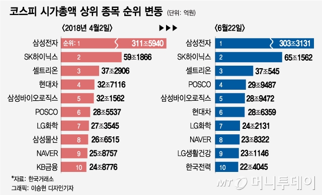 2분기 시작점인 4월 초와 비교해봤을 때 코스피 시가총액 상위 10개 그룹에서삼성물산(300,000원 ▼9,000 -2.91%)KB금융(154,200원 ▼1,800 -1.15%)이 이탈했고 LG생활건강과 한국전력이 합류했다.