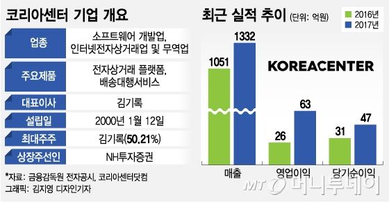 코리아센터는 전자상거래 플랫폼 서비스 '메이크샵'과 국내 점유율 1위 해외배송대행 서비스 '몰테일'을 운영하는 IT기업이다. 지난해 매출액은 전년 대비 26.7% 증가한 1332억원, 영업이익은 142.6% 증가한 63억원을 기록했다. 당기순이익은 50.2% 증가한 47억원이다.