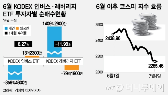 ◇하락장서 인버스 ETF 산 외국인=외국인은 지수 하락 시 수익률이 올라가는 인버스 투자로 조정장에 대응했다. 지난 6월 한 달 동안 외국인은 KODEX인버스 ETF를 13억원 순매수했고 개인은 359억원 순매도했다.