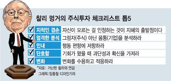 찰리 멍거는 주식투자 결정을 할 때 어떤 체크리스트를 활용할까? ‘가난한 찰리의 연감’에는 멍거가 사용할 법한 체크리스트가 분야별로 소개돼 있다. 멍거는 지적인 겸손, 엄격한 분석, 인내, 단호함, 변화, 독립성, 준비 등을 강조했다. 이중 가장 중요한 다섯 가지를 살펴보자.