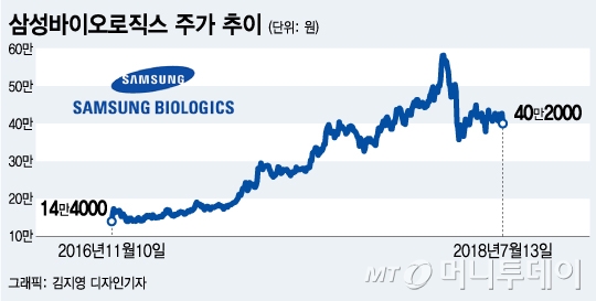 13일 코스피 시장에서삼성바이오로직스(1,580,000원 ▼18,000 -1.13%)는 전일대비 2만7000원(6.29%) 내린 40만2000원에 거래를 마쳤다. 지난 4월10일 60만원의 사상 최고가를 기록한 뒤 분식회계 논란이 불거지며 주가가 롤러코스터를 타는 흐름이다.