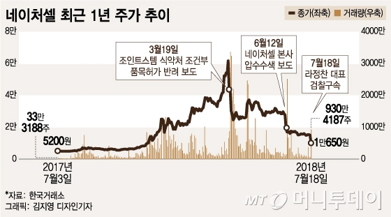 네이처셀은 지난해 10월까지 6000원대에 머물던 주가가 급등하기 시작, 지난 3월 장 중 6만4600원으로 사상 최고가를 기록했다. 약 5개월 만에 주가가 10배 가량 뛰어올랐다. 퇴행성 관절염 줄기세포 치료제 후보 물질 '조인트스템' 시판 기대감이 주가를 끌어올렸다. 그러나 지난 3월 식약처가 조건부 허가를 반려하면서 주가가 급락했다.