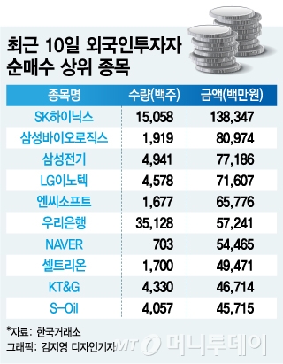 최근 10일동안 외국인 순매수 상위 종목을 살펴보면 1위 종목은SK하이닉스(998,000원 ▼35,000 -3.39%)로 이 기간동안 1383억원 어치를 순매수했다. 이어 △삼성바이오로직스(1,580,000원 ▼18,000 -1.13%)810억원 △삼성전기(516,000원 ▲2,000 +0.39%)772억원 △LG이노텍(341,000원 ▼6,000 -1.73%)716억원 △엔씨소프트(234,000원 ▲16,000 +7.34%)658억원 등이 상위권에 이름을 올렸다. 다음으로는 우리은행 NAVER 셀트리온 KT&G S-Oil 등을 많이 사들였다.