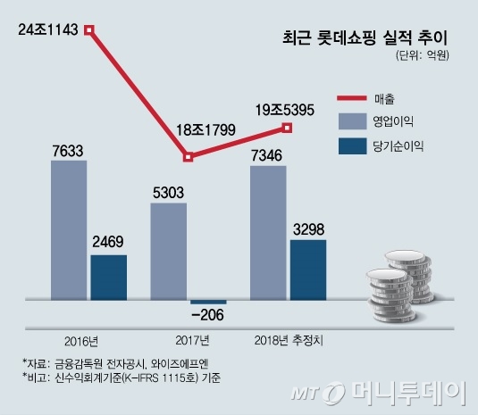 일단 중국 마트 사업 철수로 올 2분기 적자는 큰 폭으로 줄어들 전망이다. 금융정보업체 와이즈에프엔에 따르면 롯데쇼핑의 2018년2분기 영업이익 시장 예상치는 전년동기 대비 44.36% 증가한 1260억원을 기록할 것으로 집계됐다. 3개월 전 추정치보다 11.48% 높아진 수치다.