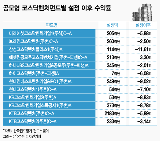 펀드 운영성과도 좋지 못해 투자자들을 추가로 모집하기 어렵다. 현재 공모로 조성된 코스닥 벤처펀드는 대부분 마이너스 수익률을 기록 중이다. 한국펀드평가 펀드스퀘어에 따르면 이날 기준 설정 이후 플러스 수익률을 기록한 펀드는 '에셋원공모주코스닥벤처기업'(3.3%) 1개에 불과하다.