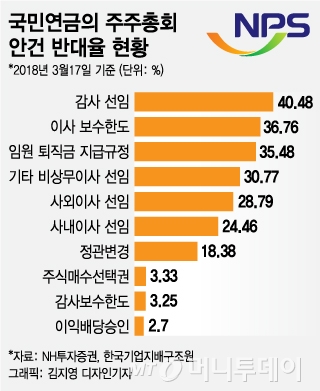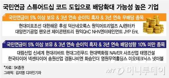 최관순 SK증권 연구원은 "대주주인 국민연금이 주주제안을 통해 해당 기업에 배당 확대 등을 건의한다면 큰 압박이 될 것"이라며 "3년 연속 순이익이 흑자인데도 무배당이거나 배당성향이 10% 미만인 기업들의 배당 확대 기대감이 확대되겠다"고 예상했다.