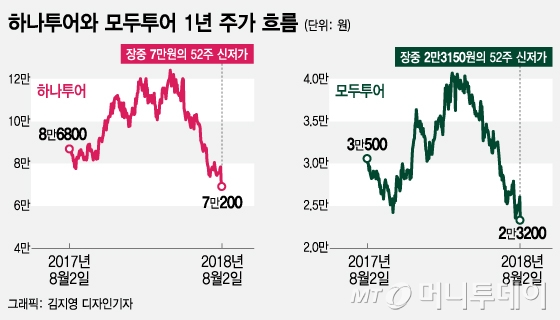 2일 코스피 시장에서하나투어(41,000원 ▼150 -0.36%)는 장중 7만원의 52주 신저가를 경신하고 전일대비 8400원(10.69%) 내린 7만200원에 거래를 마쳤다. 코스닥 시장에서모두투어(11,020원 ▼320 -2.82%)도 10.94% 급락, 장중 2만3150원의 52주 신저가를 경신했다.