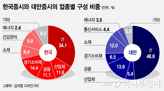 한국 증시의 업종별 비중은 IT가 34.1%, 경기소비재 14.4%, 산업재 11.6%, 금융 11.1%, 건강관리 9.8%, 소재 8.4% 에너지 2.4% 등이다. 대만은 IT가 48.8%에 달하고 금융 13.9% 소재 12.0% 경기소비재 6.5% 등인데 소재도 대부분 전자소재이므로 사실상 IT 비중이 60%에 육박한다.