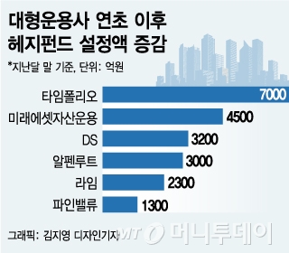 헤지펀드 성장을 주도하는 곳은 사모펀드 운용사다. 국내 최대 사모펀드인 타임폴리오자산운용은 헤지펀드 설정액이 1조8400억원(7월말 기준)으로 올 들어 7000억원(60%) 이상 늘었다. 차문현 타임폴리오자산운용 전무는 "지난 4월 출시한 4개 코스닥벤처펀드에 3000억원의 자금이 들어왔고 상반기 펀드 결산에서 대부분 재투자되는 투자수익이 늘어 설정액이 급증했다"고 말했다.