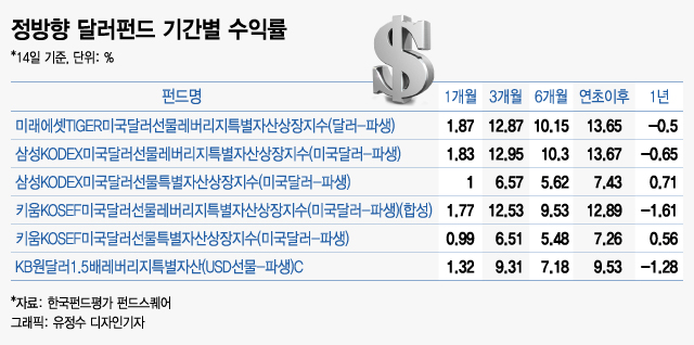 연초 기준 'TIGER미국달러선물레버리지'(13.65%) 'KOSEF미국달러선물레버리지'(12.89%) 등도 높은 수익을 얻었다. 정방향 1.5배를 추종하는 'KB원달러1.5배레버리지'는 9.53%의 성과를 냈다.
