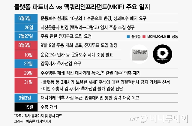 MKIF의 현 운용사인 맥쿼리자산운용은 주총 소집을 요구한 플랫폼 등 3개 회사가 주주명부 폐쇄일 직전 대차거래로 의결권을 확보한 주식에 대해 의결권 행사 금지 가처분 신청서를 법원에 제출했다고 지난달 31일 밝혔다. 플랫폼과 대차거래에 참여한 증권사는 사실무근이라는 입장이다.