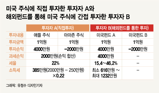 하지만 해외펀드 2곳에 투자해 A씨와 똑같이 수익을 낸 B씨는 손익통산을 적용받지 못해 4000만원에 대해 세금을 내야 한다. 더구나 펀드의 투자 수익은 배당소득세로 인식된다.
