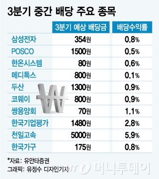 ◇21일까지 배당주 사야 3분기 분기배당 수령=올해 9월은 추석 연휴로 21일까지 주식을 매수해야 3분기 분기배당을 받을 수 있다. 3분기에 중간 배당을 하는 종목으로는삼성전자(205,000원 ▼5,500 -2.61%)POSCO(367,500원 ▲5,000 +1.38%)한온시스템(3,905원 ▼45 -1.14%)메디톡스(100,300원 ▼1,400 -1.38%)두산(1,288,000원 ▲84,000 +6.98%)코웨이(74,600원 ▼3,600 -4.6%)쌍용양회한국기업평가(100,500원 ▲100 +0.1%)천일고속(215,000원 0%)한국가구(4,995원 ▼15 -0.3%)등이 있다.