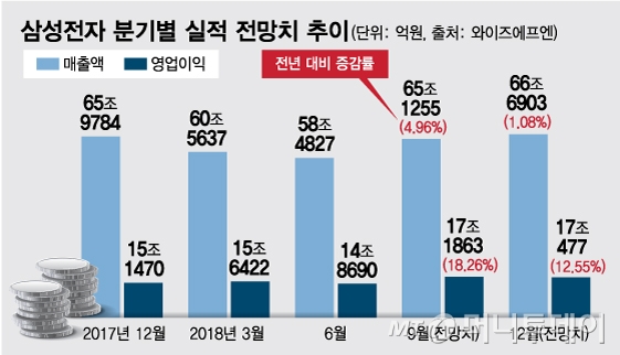 메모리 슈퍼사이클 고점에 따른 2019년 실적 우려가 팽배하지만 3분기 영업이익은 처음으로 17조원대를 돌파하며 사상 최대를 기록할 전망이다. 3분기에 이어 4분기 영업이익 컨센서스도 17조477억원으로, 17조원 이상이 예상된다.