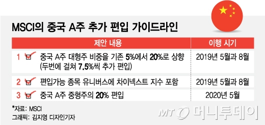 지난 25일 MSCI는 중국 A주의 MSCI EM(신흥국) 지수 편입비중 확대를 검토한 뒤 2019년 2월28일까지 이를 확정한다고 공지했다. 추가 편입비중은 A주 유동 시가총액의 20%로 현재 5% 대비 15%포인트를 늘리는 것이다.