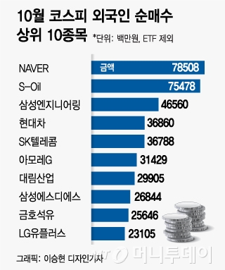 코스피가 롤러코스터를 타고 있는 10월 들어 외국인은 고배당주와 낙폭과대주를 주로 산 것으로 나타났다. 가장 많이 산 것은 액면분할 후 주가가 급락한NAVER(199,000원 ▼2,500 -1.24%)였다. 다음으로S-Oil(119,700원 ▲7,600 +6.78%)을 많이 샀고 삼성엔지니어링 현대차 대림산업 SK텔레콤 삼성에스디에스 금호석유 아모레G를 샀다. 고배당주나 낙폭과대주가 주 순매수 대상이었던 셈이다.