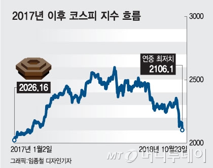 ◇무너진 수급…"증시 안전판 부재"=테마섹의 셀트리온 지분 처분이 이슈가 되는 가운데 이날 원/달러 환율은 9.2원 급등했고 3분기 실적 시즌 분위기도 우울했다. 미중 무역분쟁은 시간이 흐를수록 악화되는 가운데 주식시장의 반등을 이끌어낼 모멘텀이 없는 상황에서 외국인의 대량 매도에 기관이 가세하자 코스피 지수는 장중 2100선을 힘없이 내줬다.