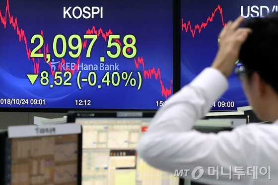 이날 코스피 지수는 전일대비 8.52포인트(0.4%) 내린 2097.58에 마감했다. 외국인이 3290억원을 순매도하며 종가 기준으로 약 19개월 만에 2100선을 내주며 하락 마감했다. 코스닥 지수는 19.7포인트(2.74%) 내린 699.3 마감, 11개월 만에 700선이 붕괴됐다.
