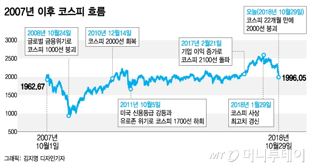 한국 주식시장이 '금융위기 트라우마'에 사로잡히며 코스피 2000선이 맥없이 무너졌다. 2008년 금융위기 10년째를 맞아 주식시장이 '10년 위기설' 공포에 사로잡히며 쏟아진 개인 투매와 국내 방어력 부재가 급락 배경으로 지목됐다.