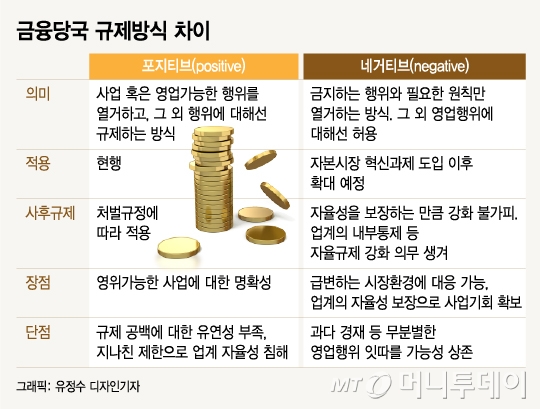 금융위의 이번 대책 역시 그동안 유지해온 포지티브 방식 규제가 급변하는 금융투자 시장에 적합하지 않고 투자자 보호에도 취약점을 보인다는 판단에서 나온 것으로 풀이된다. 금융위는 이번 혁신과제를 시작으로 금융투자업계 규제 전반에 대해 네거티브 방식 규제를 도입할 계획이다.