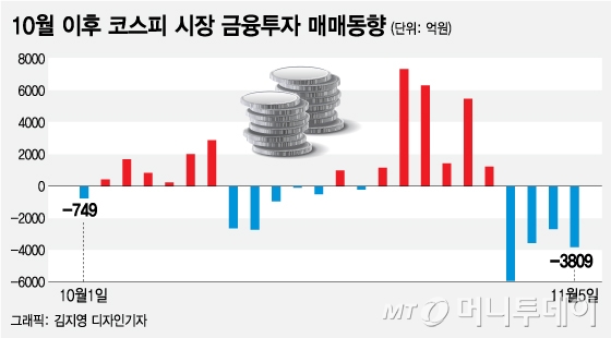 금융투자는 지난 10월23일부터 30일까지 코스피 시장에서 2조2844억원을 순매수하며 한국 증시에서 거의 유일한 구원투수로 등극했다. 하지만 10월31일부터 이날까지 1조5938억원을 순매도하며 차익거래 물량 청산에 나서, 코스피 반등을 저해하는 부메랑으로 돌아왔다.