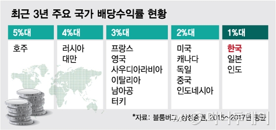 세계 시장에서 평균 2%대 배당수익률을 낸 곳은 미국과 캐나다, 독일, 중국 등이 있다. 한국이 2%대 배당수익률 국가로 평가받으려면 앞으로 안정적으로 수익률을 유지해야 한다. 기업이 매년 배당을 늘리는 추세지만 바닥 수준인 주가가 회복되면 수익률은 다시 1%대로 낮아질 수도 있기 때문이다.