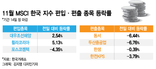 MSCI(모건스탠리캐피털인터내셔널) 한국지수 편입·편출 종목이 발표되면서 14일 해당 종목들의 희비가 엇갈렸다. MSCI 한국 지수는 글로벌 투자자들이 국내 주식에 투자할 때 가장 많이 참고하는 지수로, 편입·편출 종목들이 향후 주가 향방에 영향을 미칠 수 있는 만큼 투자자들의 관심이 집중된 것으로 보인다.