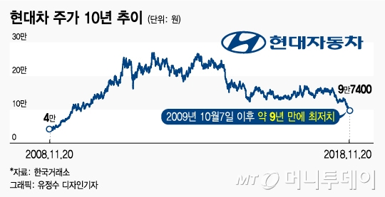 현대차 주가가 10만원 미만으로 내려온 것은 지난 2009년 10월 이후 처음이다. 이날 종가는 2009년 10월7일(9만6600원) 이후 약 9년 만의 최저치를 기록했다.