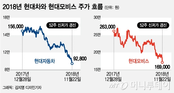 22일 코스피 시장에서현대차(499,000원 ▼9,000 -1.77%)는 5000원(5.11%) 내린 9만2800원에 마감했다.현대모비스(406,500원 ▼500 -0.12%)는 8.65% 급락하며 현대차와 나란히 장중 52주 신저가를 경신했다. 이밖에만도(50,800원 ▼100 -0.2%)가 7.80% 내렸고현대위아(78,800원 ▼1,000 -1.25%)-6.79%,한온시스템(3,865원 ▼85 -2.15%)-5.09%,기아차(159,950원 ▲750 +0.47%)-5.01% 등 자동차주가 동반 급락했다.