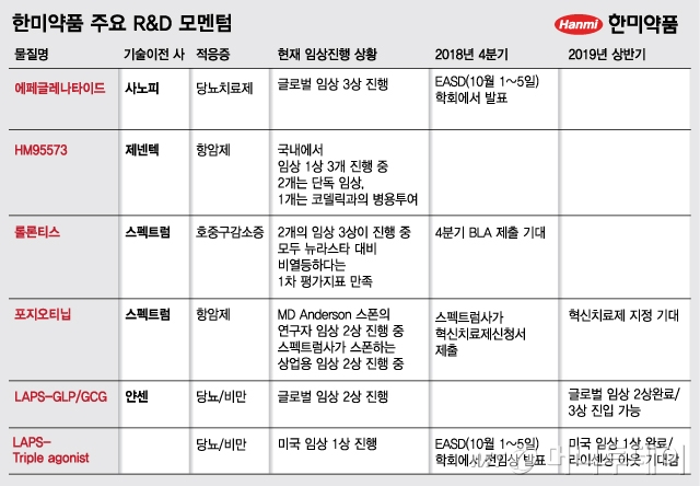 ◇"2019년 R&D 모멘텀 가장 풍부해"=한미약품은 제약사 중 내년 R&D 모멘텀이 가장 풍부한 업체로 꼽힌다. 스펙트럼사로 라이선스 아웃(L/O, 기술이전)된 '포지오티닙'(폐암·유방암 치료제)은 2019년 1분기 미국 혁신치료제 지정이 예상되는데, 그 후에는 조건부허가 판매도 가능할 것으로 보인다.