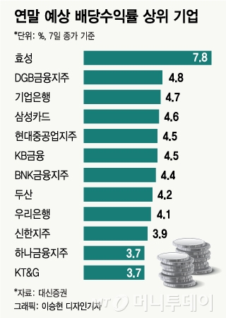 연말 예상 배당수익률이 4% 이상인 기업으로는효성(149,400원 ▼2,700 -1.78%)DGB금융지주(16,950원 ▼110 -0.64%)기업은행(21,950원 ▼50 -0.23%)삼성카드(53,800원 ▲200 +0.37%)현대중공업지주(249,500원 ▼1,500 -0.6%)BNK금융지주(17,380원 ▼280 -1.59%)KB금융(157,400원 ▲1,400 +0.9%)두산(1,219,000원 ▲15,000 +1.25%)우리은행이 꼽혔다.