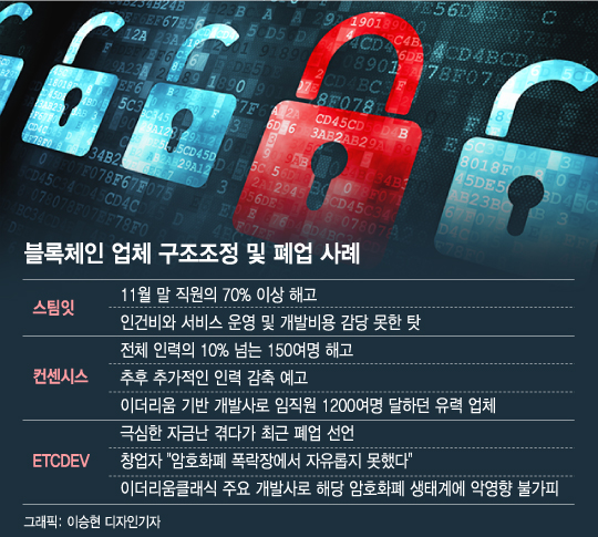 블록체인 업계가 가상자산(암호화폐) 가격 폭락으로 한파에 휩싸였다. 대규모 감원, 사업 축소가 이어지는 가운데, 폐업 사례도 나왔다. 투자자 이탈과 ICO(암호화폐 공개) 연기로 자금난에 시달리는 업체도 상당수다.