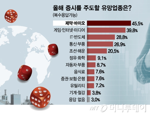 2019년 증시를 주도할 유망업종을 묻는 질문(복수응답 허용, 총 응답수 550건), 에는 제약바이오(120명, 45.5%)를 꼽은 답변이 가장 많았다. 게임·인터넷·미디어 업종(105명, 39.8%)이 뒤를 이었는데 글로벌 경기에서 상대적으로 자유로운 업종이 2019년 유망 업종 상위에 이름을 올렸다.