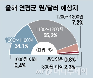 연 평균 원/달러 환율과 관련해서는 전문가 중 55.3%(146명)이 1100~1200원에서 움직일 것이라고 전망했다. 1000~1100원은 34.1%(90명), 1200~1300원은 7.2%(19명)였다.