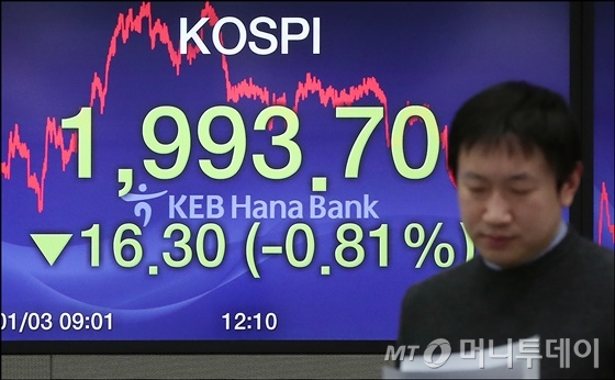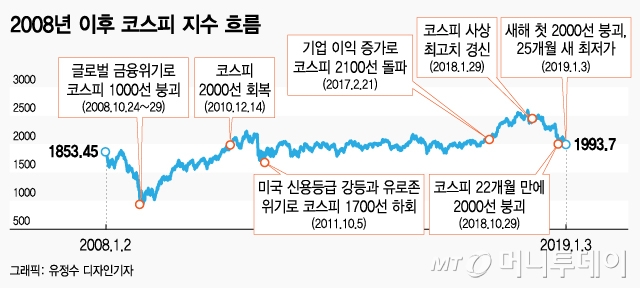 2019년 신년 증시 개장 이틀 만에 코스피 2000선이 붕괴됐다. 한국경제의 대장 업종인 반도체 수출이 급감하는 가운데 중국 경기둔화 악재까지 겹치면서 코스피는 맥없이 2000선을 하회하며 25개월 새 최저치로 밀렸다.