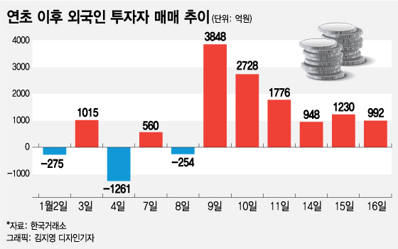 최근 코스피 상승세의 중심에는 외국인이 있다. 외국인은 최근 6거래일 연속 순매수 기록하며 지수 상승을 견인했는데, 이들은 올 들어 코스피 시장에서 1조1000억원 이상을 순매수했다.