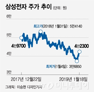 삼성전자는 반도체 업황 둔화 속 지난해 주가가 지속 하락했다. 분위기가 반전된 것은 지난 8일 4분기 잠정실적 발표를 전후해서다. 삼성전자는 8일 '어닝쇼크' 수준의 잠정 실적을 내놨지만 오히려 주가는 그를 기점으로 반등했다. 올 들어 주가 상승률만 9.3%다.