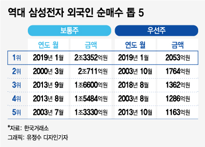 외국인의 올 1월 삼성전자 순매수 금액은 한국거래소의 주가 데이터가 존재하는 1995년 5월 이후 1월 기준으로 역대 1위일 뿐만 아니라 월별 순매수 전체를 통틀어서도 역대 1위다. 우선주까지 모두 순매수 역대 1위다.