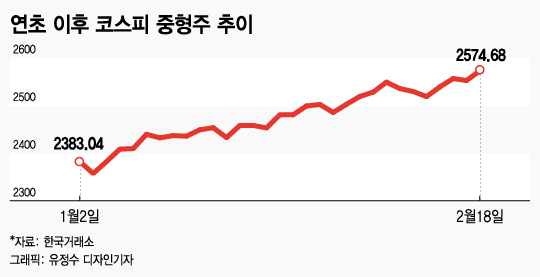 올 들어 코스피 대형주에 가려져 있던 중형주는 이달 들어 상승세가 꾸준하다. 지난달 코스피 시장에서 대형주가 8.66% 오르는 동안 중형주는 3.99% 상승하는데 그쳤다. 하지만 이달 들어 대형주가 0.15% 하락한 반면 중형주는 2.15% 상승했다.