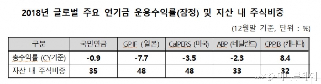 안효준 국민연금 기금운용본부장(CIO)는 28일 2018년 기금운용 수익률이 -0.92%로 잠정 집계됐다고 발표한 뒤 "국민연금뿐 아니라 주식 비중이 높은 다른 해외 연기금들도 대부분 낮은 수익률을 보였다"며 "주식 자산 비중이 포트폴리오 내 50%에 육박하는 일본 GPIF와 미국 CalPERS의 경우 작년 수익률이 각각 –7.7%, -3.5%를 기록했다"고 말했다.