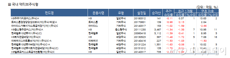 상품별로는 수익률 상위 10개 펀드 모두 마이너스를 기록했다. KB주주가치포커스(주식)A(-0.11%)와 트러스톤정정당당성과보수[자](주식-파생)A(-0.96%), 마이다스거북이70소득공제장기[자]1(주식)C(-1.02%), KB중소형주포커스[자](주식)A(-1.34%). 한국밸류10년투자1(주식)(C)(-1.39%) 등의 수익률이 상위권을 차지했다.