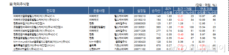상위 10개 펀드 중에선 상대적으로 미국 등 대표 헬스케어 업종이 상승세를 보이며 미래에셋글로벌헬스케어[자]1(주식)C-A(1.83%)와 미래에셋연금글로벌헬스케어[자]1(주식)C-C(1.83%), 프랭클린미국바이오헬스케어[자](주식-재간접)A(1.26%) 등 해외 헬스케어 펀드의 성과가 양호했다. 한화브라질[자](주식-재간접)A(1.57%)와 미래에셋브라질업종대표[자]1(주식)C-A(0.74%) 등 브라질 펀드도 수익률 상위권을 차지했다.
