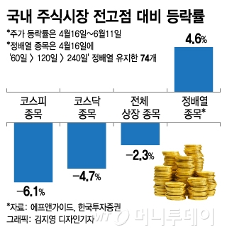 실제 연중 전고점인 4월16일부터 6월11일까지 증시 등락률을 분석했더니 3개월간(4월16일 기준) 정배열 상태를 유지했던 74개 종목의 평균 수익률은 4.6%로 시장 평균치를 훨씬 웃돌았다. 같은 기간 코스피 평균 수익률은 -6.1%, 코스닥은 -4.7%였다.