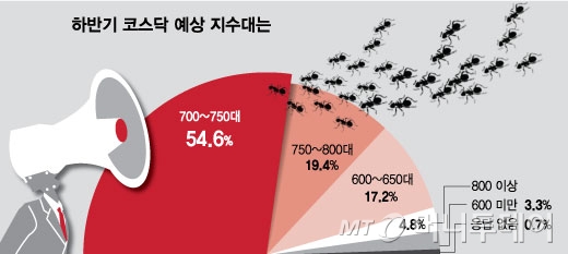 코스닥 지수는 700선을 고점으로 꼽은 이들이 과반 이상을 차지했다. 전체 응답자 중 54.6%(149명)이 '700~750선'을 고점으로 꼽았다. 현재 720선에서 등락을 거듭하고 있는 점을 감안할 때, 상승 폭은 크지 않을 것이란 결론이 나온다. '750~800선'은 19.4%(53명), '600~650선'은 17.2%(47명)으로 나타났다.