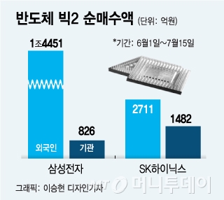 그러나 외국인들은 6월 들어 이날까지 삼성전자를 1조4451억원 어치 사들이며 아낌없는 애정을 쏟았다. SK하이닉스 주식도 2711억원 어치 순매수했다. 코스피 시장에 대한 순매수액(1조4769억원)을 뛰어넘는다.
