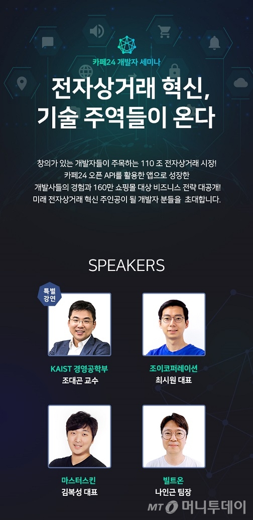 이 세미나에선 카페24의 온라인 쇼핑몰 플랫폼, 오픈 API(애플리케이션 프로그램 인터페이스)와 앱스토어 등 앱 개발 환경, 빅데이터 활용 방안, 전자상거래 서비스 개발 노하우 등에 대한 논의가 펼쳐질 예정이다. 빅데이터 전문가인 조대곤 카이스트 경영공학부 교수가 특별 강연자로 참석한다. 최창규 카페24 이사, 김복성 마스터스킨 대표, 최시원 조이코퍼레이션 대표, 나인근 빌트온 팀장이 개발 경험과 노하우를 소개한다.